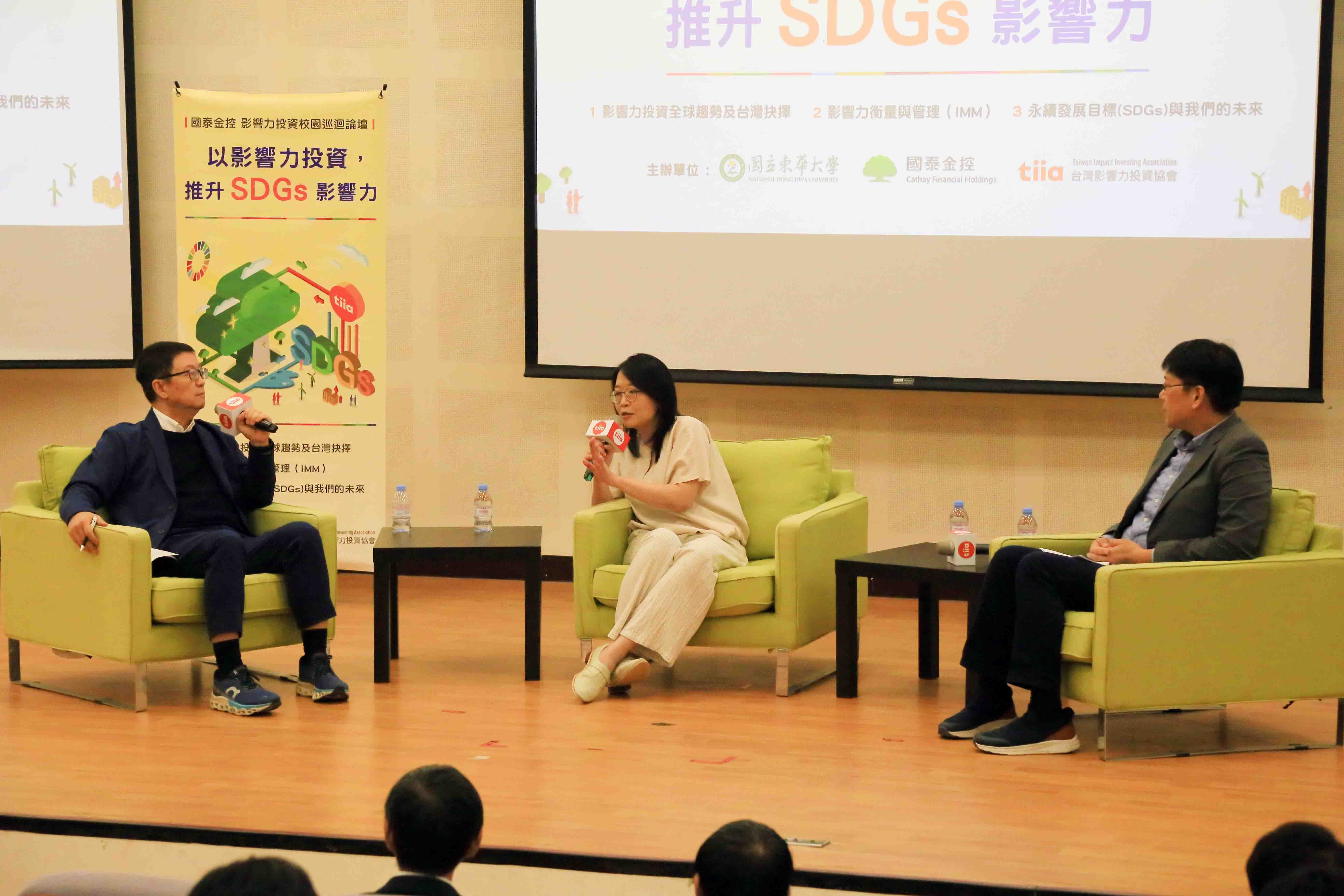 國泰金控協理黃靖涵指出,根據OECD統計,為達成2030年SDGs目標,全球尚缺4兆美元資金,但若全球金融業願意撥出1%至1.5%的資產投入環境與社會領域,目標便有望達成。她強調影響力投資正是一個能「又賺錢又可以做SDGs」的重要概念。黃協理將在座青年視為「穩賺不賠的稀缺資產」,表示國泰金控樂意投資於青年的培訓與教育,期許學子們激發對永續的想像,共同為社會做出貢獻。