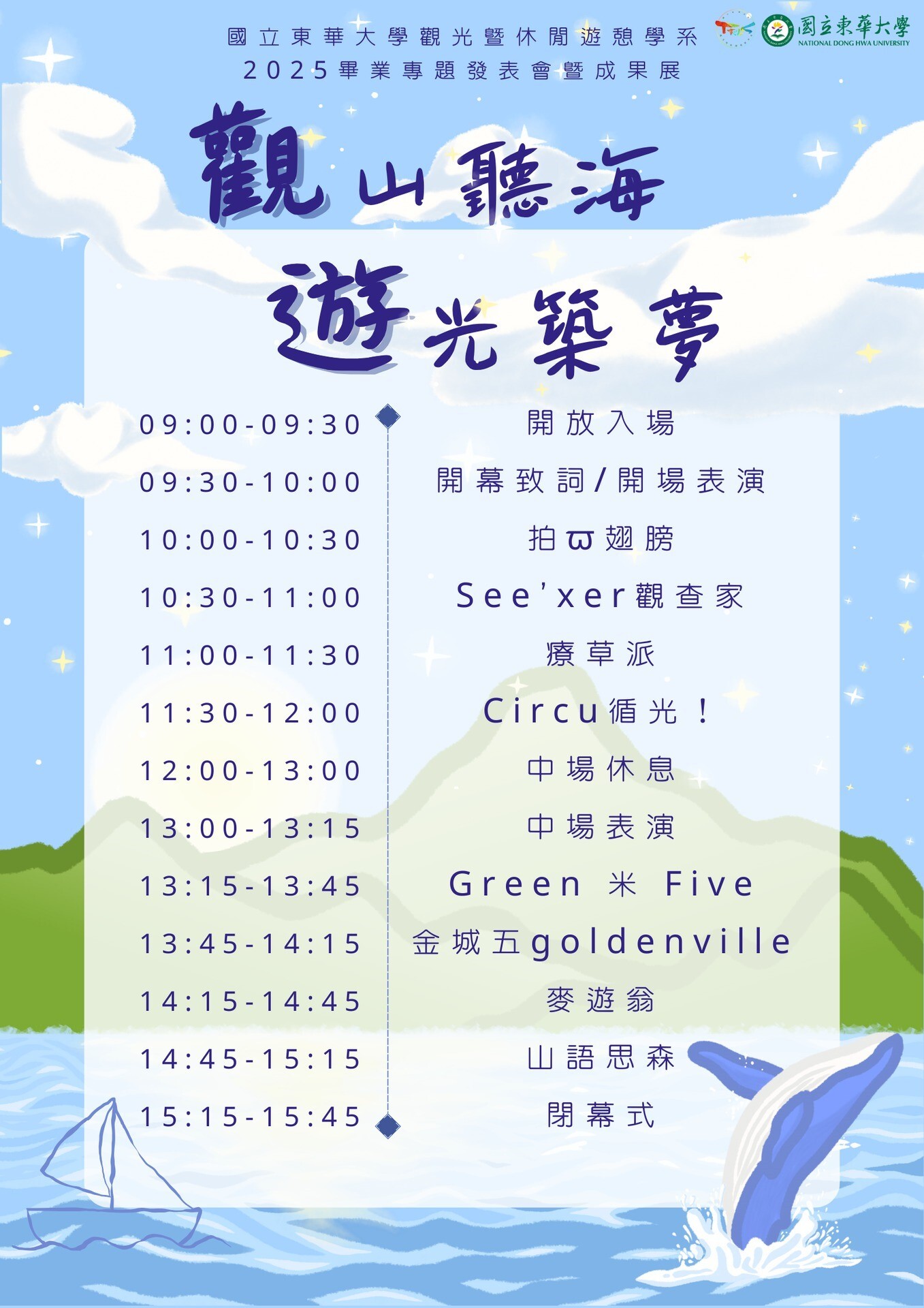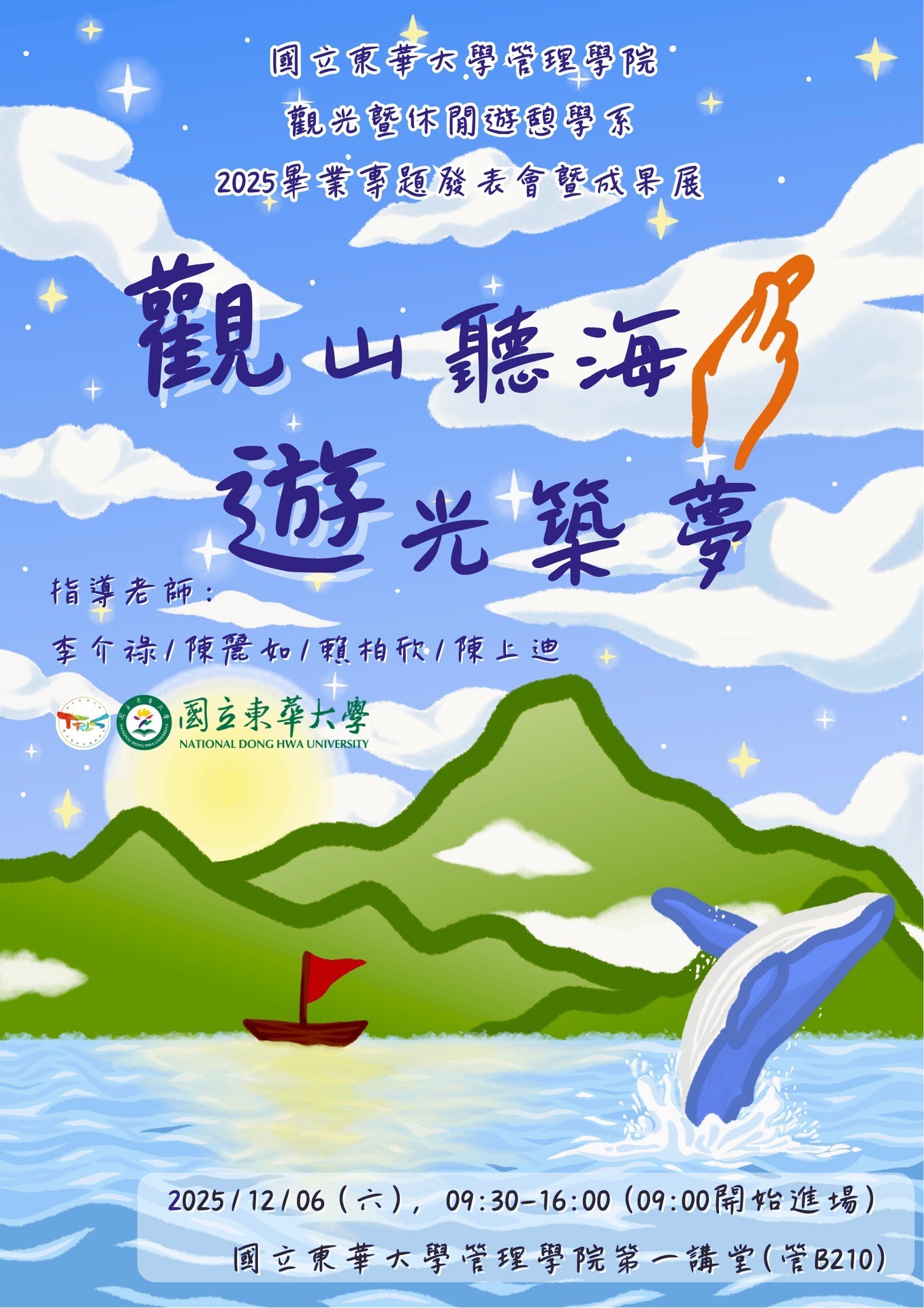國立東華大學觀光暨休閒遊憩學系將於2025年12月06日(週六)舉行「2025年畢業專題發表會暨成果展」,本次活動主題為「觀山聽海,遊光築夢」,聚焦於學生與地方產業、文化、社區的深度合作成果,攜手共同創造觀光與休閒遊憩的新願景。