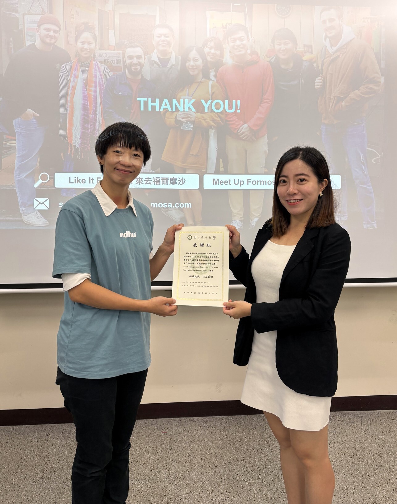 為提升學生跨文化溝通能力並接軌國際行銷趨勢,國立東華大學管理學院數位行銷與服務創新國際學士班於114 年10月22日舉辦「青創力量:用英文說故事行銷臺灣」專題講座。本次特別邀請獲獎無數的青年創業公司「Like It Formosa(來去福爾摩沙)」創辦人暨CEO鍾炘儒(Sarah)女士擔任講師,與現場20位同學深度交流如何將臺灣文化轉化為具備國際吸引力的品牌故事。