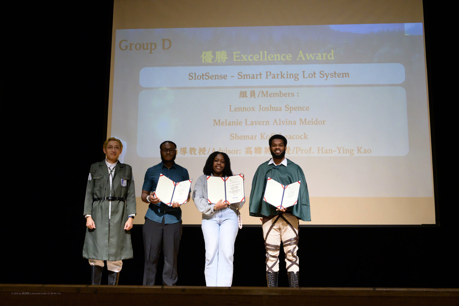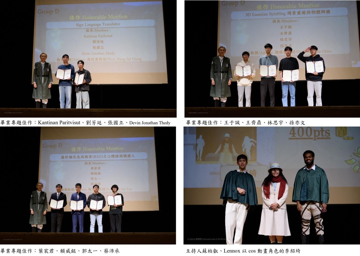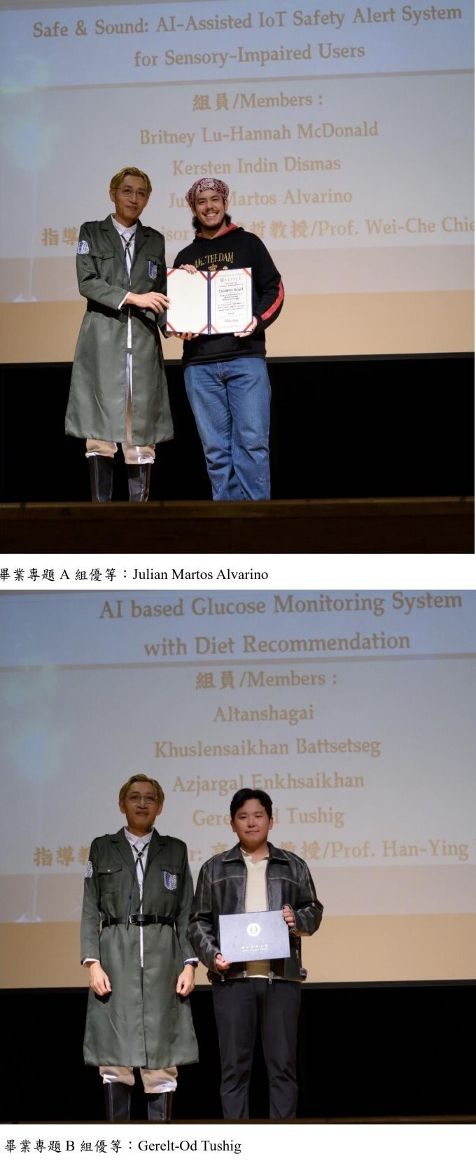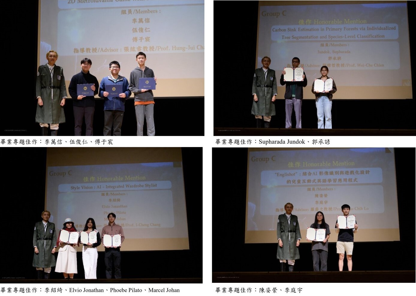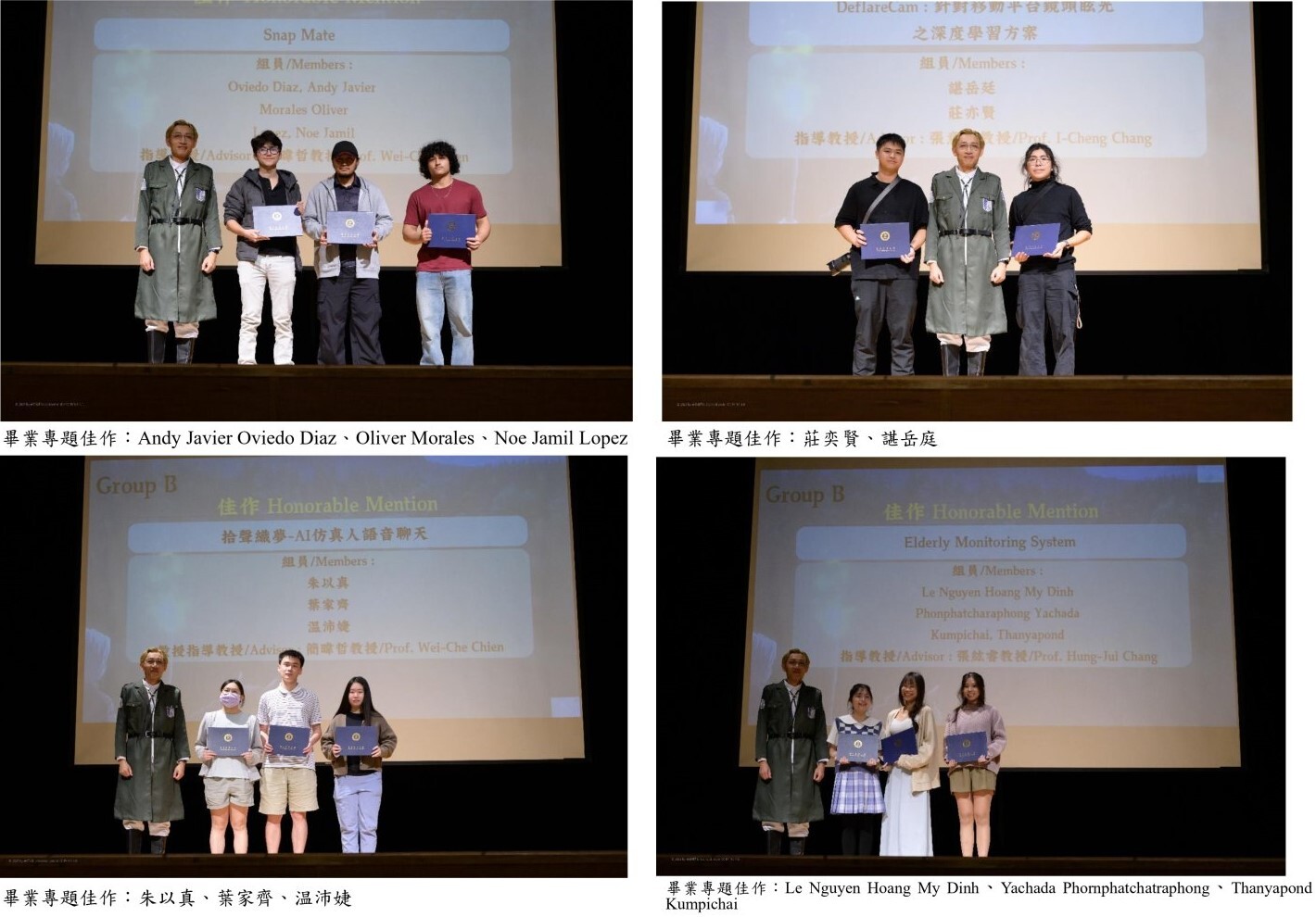 A6 優等:Safe & Sound: AI-Assisted IoT Safety Alert System for Sensory-Impaired Users Using Neural Networks and Haptic Interfaces 學生:Britney Lu-Hannah Mc Donald、Kersten Indin Dismas、Julian Martos Alvarino A4 佳作:Snap Mate 學生:Andy Javier Oviedo Diaz、Oliver Morales、Noe Jamil Lopez A5 佳作:基於對抗樣本之人臉圖像隱私保護方法與雲端服務系統建構 學生:唐于田、鄭宇翔、吳陶樂 A7 佳作:DeflareCam:針對移動平台鏡頭眩光之深度學習解決方案 學生:諶岳廷、莊奕賢 B5 優等:AI-Based Glucose Monitoring System with Diet Recommendation 學生:Altanshagai、Khuslensaikhan Battsetseg、Azjargal Enkehsaikhan、Gerelt-Od Tushig B1 佳作:2D Metroidvania Game with Focus on AI Development 學生:李萬信、伍俊仁、傅于宸 B4 佳作:Elderly Monitoring System 學生:Le Nguyen Hoang My Dinh、Phornphatcharaphong Yachada、Thanyapond Kumpichai B6 佳作:拾聲織夢-AI仿真人語音聊天 學生:朱以真、葉家齊、温沛婕 C5 優等:JAAB : Multistage Pipeline for Jotting & Assessing Actions in Boxings 學生:Jaime Rolando Mejia、Nisbett Rasarles Julsei Onell、Gede Bagus Wirayasa、Sydney Anthony Bailey C4 佳作:Style Vision : AI - Integrated Wardrobe Stylist 學生:李紹綺、Elvio Jonathan、Phoebe Pilota、Marcel Johan C7 佳作:「Englishot」:結合AI影像識別與遊戲化設計的兒童互動式英語學習應用程式 學生:陳姿縈、李庭宇 C10 佳作:Carbon Sink Estimation in Primary Forests via Individualized Tree Segmentation and Species-Level Classification 學生:Supharada Jundok、郭承諺 D2 優等:SlotSense - Smart Parking Lot System 學生:Lennox Joshua Spence、Melanie Lavern Alvina Meidor、Shemar Kofi Leacock D4 佳作:Sign Language Translator 學生:Kantinan Paritvisut、劉芳廷、張國立、Devin Jonathan Thedy D5 佳作:3D Gaussian Splatting 場景重建與物體辨識 學生:王于誠、王齊鼎、林思宇、孫亦文 D10 佳作:基於強化生成檢索(RAG)之心理諮商機器人 學生:葉宸君、賴威銘、郭太一、蔡沛承 畢業專題A、B組優等 畢業專題C組優等:Jaime Rolando Mejia、 Nisbett Rasarles Julsei Onell、Gede Bagus Wirayasa、 Sydney Anthony Bailey 畢業專題D組優等:Lennox Joshua Spence、 Melanie Lavern Alvina Meidor、Shemar Kofi Leacock