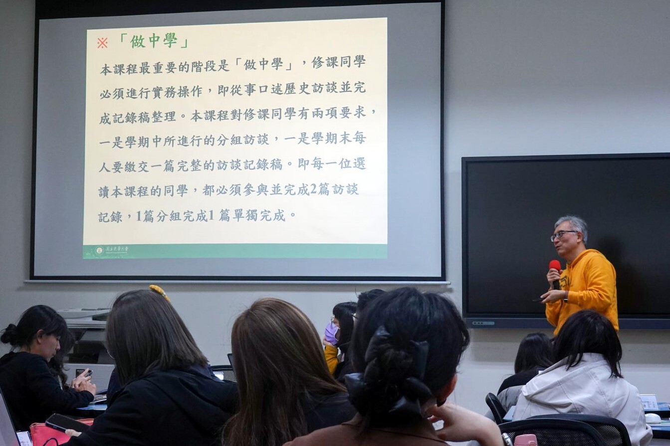 第一天壓軸課程由陳進金教授主講「口述歷史課程的操作與評量」。課程指出,口述歷史並非單純聽故事,訪談前的充分準備至關重要,訪問者須深入掌握受訪者背景與歷史脈絡,方能提出具引導性的問題,促成深度對話。課程後段則聚焦在老師們如何在課堂上操作口述歷史的課程,提供建議及指引。