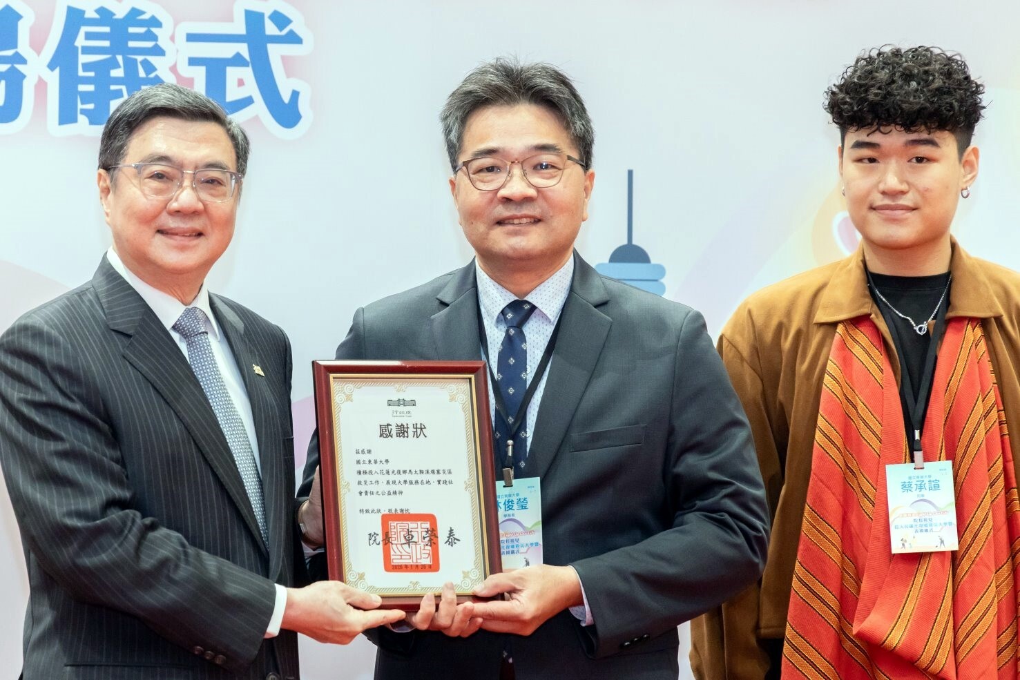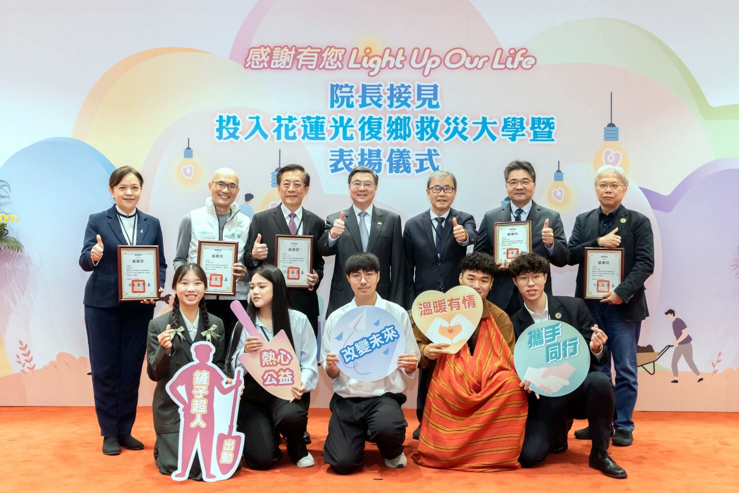 行政院為表彰大專校院學生投入花蓮光復鄉救災之義行,特於2026年1月26日在行政院大禮堂舉辦「感謝有您.Light Up Our Life」表揚大會。由行政院卓榮泰院長親自接見與會師生,感謝去(114)年9月全臺30所大學師生化身「鏟子超人」,投入馬太鞍溪堰塞湖災後復原工作。國立東華大學由林俊瑩學務長與語傳系二年級學生蔡承諠Umaw Yaway代表出席,接受行政院公開表揚,彰顯青年學子在公共事務中所展現的責任感與影響力。